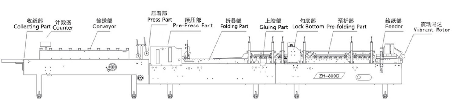 ZH-800D/900D/1000D型勾底糊盒機(jī)與ZH-800G糊盒機(jī)結(jié)構(gòu)基本相同,在該機(jī)基礎(chǔ)上增加了三個(gè)部分: 1、上壓輪采用皮帶運(yùn)行結(jié)構(gòu),使走紙更穩(wěn)定。 2、在本折出紙部增加了預(yù)壓部使出紙更平整。 3、收紙部采用等待收紙功能,電機(jī)可以單獨(dú)調(diào)速,使收紙更合理。